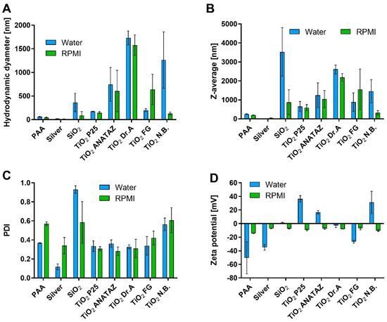 Analysis of physico-chemical properties of NPs. (A) Hydrodynamic diameter based on the particle number distribution; (B) Z-average size based on the intensity distribution and (C) polydispersity index (PDI) of the number distribution measured with DLS; (D) Zeta potential in water and RPMI media with 10% FBS (m/v). Mean values with standard error of the mean from three independent measurements are shown.