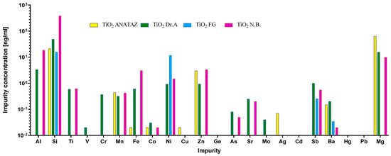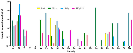 Impurities are a common but often-overlooked component of different nanomaterials. They originate either from the material used for NP preparation, or from other components that are used in the manufacturing process. Importantly, these impurities can be responsible for the activation or suppression of the immune system, and they can consequently lead to artifacts in immunotoxicity studies [44,60,61,62,63]. Therefore, the LAL test was performed to confirm that there was no endotoxin contamination. To evaluate the leachability of metal ions from the NP suspensions, the samples were aged in physiological NaCl solution for 24 h, and the concentration of elements was measured using ICP-MS (Figure 2). In general, Si was found in higher quantities than other elements, due to sample preparation in glass bottles. As expected, silver NPs leached substantial quantities of silver ions. We also detected the leaching of the impurities Zn, Mg, and Fe from DrA TiO2 NPs, and Mg and Fe from silver NPs; Mg was also detected in ANATAZ and N.B. TiO2. As expected for PAA coated cobalt–ferrite NPs, the leaching of Co was detected, while for SiO2 NPs, substantial amounts of Si were present.
