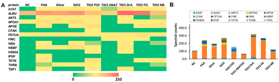 The composition of the NP protein corona after the incubation of NPs in complete cell culture medium RPMI-1640 with 10% (v/v) FBS was analyzed using MS (Figure 3). A complete list of identified proteins, their theoretical isoelectric points (pIs), molecular masses, and biological functions can be found in the Supplementary material in Table S1, and the relative percentages of proteins with a relative abundance in protein corona that is greater than or equal to 5%, in Figure S5. Differences in the relative protein abundance in coronas between different NPs can be clearly observed. The largest numbers of different proteins were found in the protein coronas of SiO2, PAA, and P25 TiO2 NPs. In the analysis, 28 different proteins were identified, out of which only 15 proteins were detected in at least two independent replicates of the same NPs, and these are presented in Figure 3 and Figure S5. Six proteins were common to all NPs. As expected, serum albumin (ALBU), which is the main component of FBS, was also the most abundant protein in all NPs coronas and in the negative control sample. Other proteins that were present on all NPs were α-1-antiproteinase (A1AT), apolipoprotein A-I (APOA1), α-2-HS-glycoprotein (FETUA), hemoglobin subunit α (HBA), and hemoglobin fetal subunit β (HBBF), out of which, A1At and FETUA were also present in the negative control.
