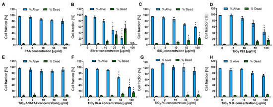 THP-1 viability and membrane damage following 24 h incubation with (A) polyacrylic acid (PAA)-coated NPs, (B) Ag NPs, (C) engineered SiO2 NPs, (D) TiO2 P25, (E) TiO2 ANATAZ NPs, (F) TiO2 DrA NPs, (G) TiO2 food-grade (FG), and (H) TiO2 N.B. NPs. The viability was determined with Hoechst/PI differential staining. Please note that lower concentrations were used for silver NPs. Mean and standard error are shown for three independent experiments. Statistical significance is displayed as follows: ns (p > 0.05); * p ≤ 0.05; ** p ≤ 0.01; *** p ≤ 0.001, **** p≤ 0.0001.