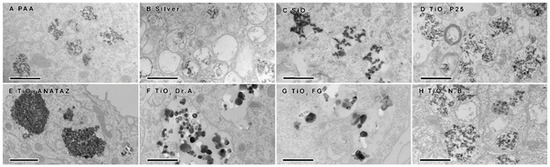 Transmission electron microscopy analysis of differentiated THP-1 cells following 24 h incubation with 50 µg mL−1 (25 µg mL−1 for silver NPs) of (A) polyacrylic acid (PAA)-coated magnetic NPs, (B) silver NPs, (C) engineered SiO2 NPs, (D) TiO2 P25, (E) TiO2 ANATAZ, (F) TiO2 DrA, (G) TiO2 food-grade (FG), and (H) TiO2 N.B. NPs. Scale bars correspond to 600 nm.