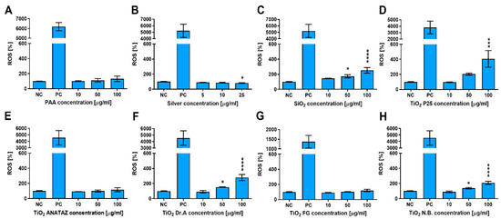 ROS induction in THP-1 macrophages following 24 h incubation with increasing concentrations of (A) polyacrylic acid (PAA)-coated NPs, (B) silver NPs, (C) engineered SiO2 NPs, (D) TiO2 P25, (E) TiO2 ANATAZ NPs, (F) TiO2 DrA NPs, (G) TiO2 food-grade (FG), and (H) TiO2 N.B. NPs, as determined with CM-H2DCFH-DA assay. For the positive control (PC), cells were incubated with 1 mM H2O2 for 20 min. Please note that lower concentrations were used for silver NPs. Mean and standard error of three independent experiments are shown. Statistical significance is displayed as follows: ns (p > 0.05); * p ≤ 0.05; *** p ≤ 0.001, **** p≤ 0.0001.