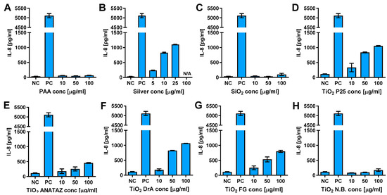 IL-8 secretion from THP-1 macrophages following 24 h incubation with increasing concentrations of (A) polyacrylic acid (PAA)-coated NPs, (B) silver NPs, (C) engineered SiO2 NPs, (D) TiO2 P25, (E) TiO2 ANATAZ NPs, (F) TiO2 DrA NPs, (G) TiO2 food-grade (FG), and (H) TiO2 N.B. NPs, as determined using ELISA. Cell exposed to 100 ng mL−1 LPS for 24 h were used as a positive control. Please note, that lower concentrations were used for silver NPs due to extensive cells death. Representative experiment of the three experiments is shown. Mean and standard error of three replicates of the same biological repeat are shown.