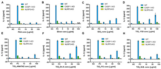 We observed the significant increase in IL-1β secretion for P25, DrA, and FG TiO2, while for PAA and silver NPs no IL-1β secretion was observed (Figure 8). To confirm that the observed IL-1β secretion was mediated through NLRP3 inflammasome, the experiments were repeated on knock-out THP-1 cells deficient in either Caspase 1 or NLRP3 proteins, which are crucial components of NLRP3 inflammasome. The secretion of IL-1β from caspase-1 and NLRP3 knock-out cells was almost completely diminished compared to wild-type THP-1, confirming the involvement of NLRP3 inflammasome in NPs-triggered IL-1β secretion.