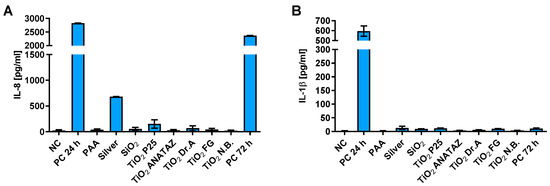 In terms of cytokine secretion, we did not detect IL-6 or TNF-α for any of the selected NPs (Figures S3 and S4) following 24 h exposure. Magnetic PAA have altogether not induced any secretion of the tested cytokines (IL-6, TNF-α, IL-8, and IL-1β). However, a dose-dependent secretion of IL-8 (silver NPs), IL-1β (SiO2 and N.B. TiO2), or both cytokines (P25 TiO2, ANATAZ TiO2, DrA TiO2, and FG TiO2) was obtained to various extents (Figure 7 and Figure 8), with a significant increase only at higher NP concentrations (>50 µg mL−1) in THP-1 macrophages. In bone marrow-derived mouse macrophage cells, dose-dependent IL-1β secretions were obtained only for P25 TiO2 and N.B TiO2 (Figure S8), demonstrating variances in response due to interspecies differences. Our results are in agreement with several other studies that also observed IL-1β and/or IL-8 secretion for different TiO2 NPs [86,87]. IL-8 is a pro-inflammatory chemokine that plays a key role in the activation of neutrophils, while IL-1β is a known pro-inflammatory chemokine for which an initial induction of pro-IL-1β expression is needed (a priming step).