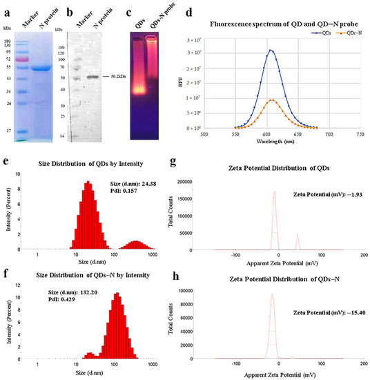 In view of the principle of electrophoresis separation, the migration rate of N protein-modified QDs was much lower than that of QDs (Figure 1c). The peaks of fluorescence spectra showed that the fluorescence intensity of QDs decreased after modification (Figure 1d). The diameter distribution of these nanoparticles was measured by dynamic light scattering (DLS). The results of DLS showed that the average hydrated diameter of the QDs and QD-conjugated N protein were 24.38 nm and 132.20 nm, respectively (Figure 1e,f), and the ζ potential switched from −1.93 mV to −15.40 mV (Figure 1g,h). All the data above suggested efficient conjugation between QDs and N protein.