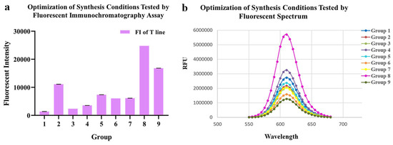 Optimization of conjugating conditions of QDs-N probes. (a) Fluorescent intensity of 9 probes synthesized with different conditions tested by fluoro-immunoassay. (b) Fluorescent Spectrum of 9 probes, which indicated that the conjugation 8 presented the best fluorescent performance.