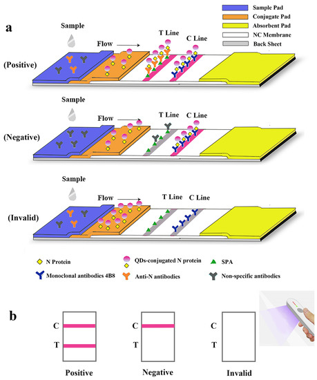 A lateral flow immunoassay for rapid detection of specific antibodies against SARS-CoV-2 N protein was loaded on the test strip, which was assembled as follows: sample pad (300 mm × 15 mm), conjugate pad (300 mm × 8 mm), absorbent pad (300 mm × 18 mm), and NC membrane (300 mm × 15 mm) attached to a semi-rigid polyethylene sheet. Specifically, sample pads were soaked with treatment fluid (0.1 M PBS, containing 5% sucrose, 0.05% sodium azide, 0.3% Tween 20 and 1% BSA) and dried at 42 °C for 4 h. The conjugate pad, test line (T line) and control line (C line) were, respectively, coated with QDs-labeled N protein, Staphylococcus aureus protein A (SPA) and mAb 4B8 (with the titer of 1:2.048 × 106 and the Kaff of 1.22 × 109 L/mol, Supplemental Figures S1 and S2), using XYZ Biostrip Dispenser (Biodot, Richmond, CA, USA). After being assembled with all sections, the sheet was further cut into strips (50 mm × 3 mm) by CM 4000 Cutter (Biodot, Richmond, CA, USA) and packaged in a plastic bag with silica desiccant. The schematic diagram of overall structure of the test strip is shown in Figure 3a.