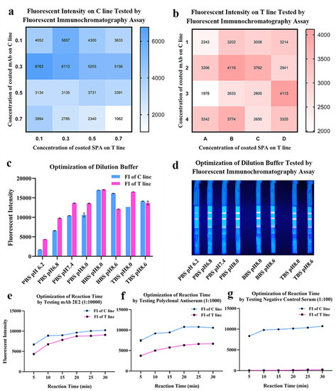 Optimization of coating concentrations, pH and buffer solution of the lateral flow assay. (a,b) Optimization of coated mAbs and SPA on the T line and the C line. The fluorescent intensity data was presented by heat map. (c,d) Optimization of the dilution buffer and pH. (e–g) Optimization of reaction time by testing mAbs, antiserum and negative control.