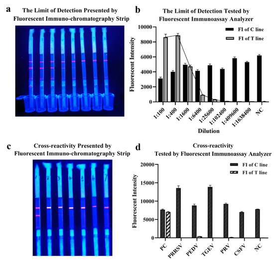 The limit of detection of QDs-FICA was determined by a monoclonal antibody, which was fourfold diluted from 1:1 × 102 to 1:1.638 × 106 (with the concentration of 5 × 10−2 to 3.05 × 10−6 mg/mL). Results indicated that the limit of detection was 1:1.024 × 105 with an IgG concentration of 48.84 ng ng/mL (Figure 5a,b). Cross-reactivity with positive samples (n = 5) containing antibodies to other relevant zoonotic coronaviruses and respiratory infection-related viruses (PRRSV, PEDV, TGEV, PRV and CSFV) was detected. The result indicated that (Figure 5c,d) the QDs-FICA performed no cross-reactivity with other coronaviruses, except for the weak interaction with PEDV-positive serum.
