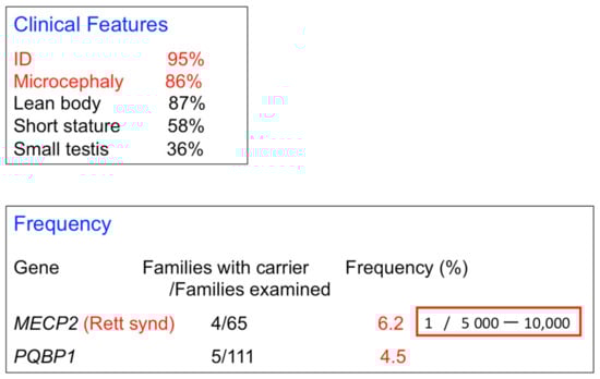 The frequency of all PQBP1 gene mutations has not yet been determined, although Renpenning syndrome spectrum is a rare disease (personal communication). However, one report has suggested that the Renpenning syndrome spectrum occurs at a relatively high frequency, near that of Rett syndrome [71] (Figure 2).