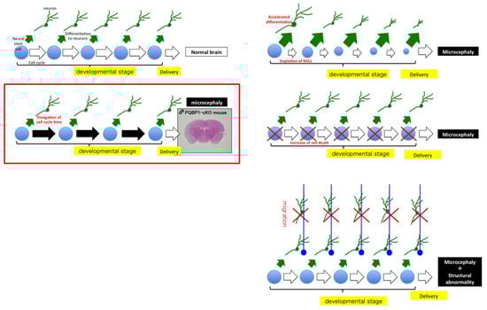 Although a generation of PQBP1 knockout mice has not been developed, three conditional knockout mouse models of PQBP1 have been reported [23,24,56]. PQBP1-cKO mice generated using nestin-Cre have microcephaly and exhibit cognitive dysfunctions [56]. Detailed analyses have revealed that the total cell cycle time of neural stem progenitor cells (NSPCs) is elongated, and the frequency of cell division is decreased before delivery [77]. This mechanism is distinct from previously established mechanisms of microcephaly, such as depletion of neural stem cells by enhanced differentiation to neurons, increased cell death of NSPCs and/or neurons, and impaired migration of differentiated neurons, all of which do not exist in Pqbp1-cKO mice [77] (Figure 3). Comprehensive analyses of Pqbp1-cKO mice have revealed that the expression profiles of cell cycle-relevant genes and synapse-relevant genes are widely affected due to loss of PQBP1 [77]. Surprisingly, Pqbp1-cKO mice generated by nestin-Cre exhibit a small body size. Bone CT showed a reduction in bone mass, and bone histology revealed impaired bone formation and deficiency of chondrocytes in Pqbp1-cKO mice [57]. The bone phenotype might be derived from an abnormality of mesenchymal stem cells, a part of which expresses nestin [57].