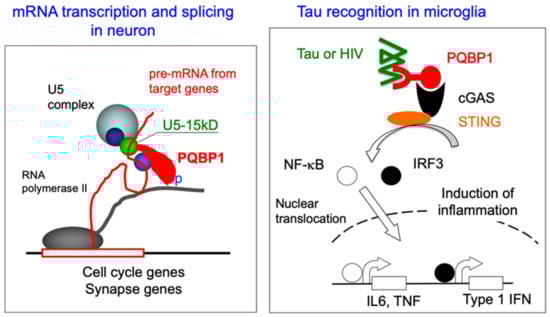 PQBP1 functions in the nucleus of neurons and the cytoplasm of microglia. (Left) In neurons, PQBP1 functions as an adaptor between transcription and splicing. Immediately after hnRNA (pre-mRNA), splicing complexes assemble for cleavage of intron. PQBP1 binds to the C-terminal tail of RNA polymerase II in a phosphorylation-dependent manner and promotes the splicing of specific types of hnRNAs. PQBP1 is known to directly interact with U5-15kD in U5 spliceosome. (Right) In microglia, PQBP1 is known to play another role as an intracellular receptor for pathogens. PQBP1 recognizes cDNA of HIV to trigger cGAS-STING signaling pathway for inflammation. Recently it is shown that PQBP1 recognizes the Tau protein, which is implicated in Alzheimer’s disease and various Tauopathies in a similar manner than if the Tau were a pathogen. It is yet to be investigated whether PQBP1 triggers cGAS-STING pathway in neurons or whether PQBP1 regulates splicing in microglia.