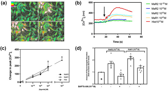 Dartt et al. demonstrated that histamine stimulates an increase in [Ca2+]i and glycoconjugate secretion in rat conjunctival goblet cells [34]. To investigate if MaR2 inhibits histamine stimulated glycoconjugate secretion, rat conjunctival goblet cells were preincubated with MaR2 (10−8 M) for 30 min prior to stimulation with histamine (10−5 M). Histamine stimulated secretion to 1.75 ± 0.13 above basal (p = 0.001, Figure 10b; n = 4). Preincubation with MaR2 decreased the response to 1.09 ± 0.19 above basal (p = 0.029). This indicates that MaR2 inhibits histamine stimulated glycoconjugate secretion.