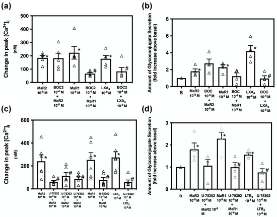 Inhibition of the BLT1, but not the ALX/FPR2 receptors acts on stimulation of [Ca2+]i and secretion by MaR2. Goblet cells were treated with the ALX/FPR2 receptor inhibitor BOC2 (10−4 M) for 30 min and stimulated with MaR2 10−8 M (a,b), MaR1 10−8 M (a) MaR1 10−9 M (b), LXA4 10−9 M (a) or LXA4 10−8 M (b). Goblet cells were treated with the BLT1 receptor inhibitor U-75302 (10−8–10−6 M) for 30 min and stimulated with MaR2 10−8 M (c,d), MaR1 10−8 M (c), MaR1 10−9 M (d) or LTB4 10−9 M (c) LTB4 10−8 M (d). [Ca2+]i was measured in (a,c); secretion in (b,d). Data are mean ± SEM of five (a), four (b), six (c) and four (d) experiments. White triangles indicate individual data points. * shows significance above basal. # shows significance between agonist and inhibitor + agonist.