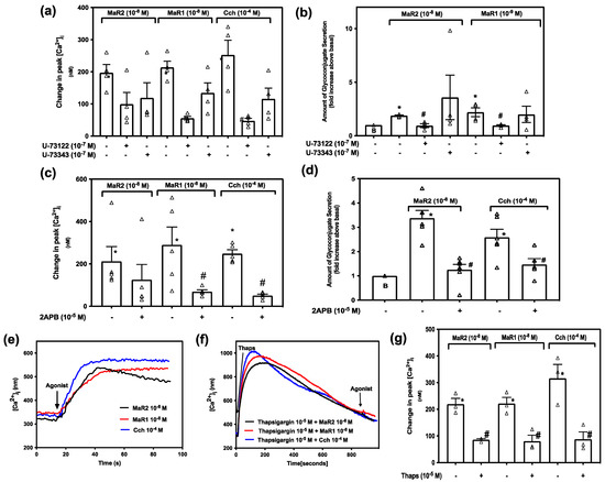 Maresin 2 increase in [Ca2+]i, but not secretion, is independent of the PLC-pathway in rat conjunctival goblet cells. Goblet cells were treated with vehicle, the active PLC inhibitor U-73122 or the inactive PLC inhibitor U-73343 both at 10−7 M for 30 min and stimulated with MaR2 (10−8 M), MaR1 (10−8 M) or Cch (10−4 M). (a) shows changes in peak [Ca2+]i and (b) shows glycoconjugate secretion. Goblet cells were treated with vehicle or 2APB (10−5 M) and stimulated with MaR2 (10−8 M), MaR1 (10−8 M) or Cch (10−4 M). (c) shows changes in peak [Ca2+]i, and (d) shows glycoconjugate secretion. Goblet cells were stimulated with MaR2 (10−8 M), MaR1 (10−8 M) or Cch (10−4 M) alone or incubated with vehicle or thapsigargin (10−5 M) for 15 min and then stimulated with MaR2 (10−8 M), MaR1 (10−8 M) or Cch (10−4 M). (e,f) show changes in [Ca2+]i with time, while (g) shows changes in peak of [Ca2+]i. Data are mean ± SEM of four (a), four (b), five (c), six (d), and three (e–g) experiments. White triangles indicate individual data points. * shows significance above basal. # shows significance between MaR2 and inhibitor then MaR2 or control and inhibitor then control.