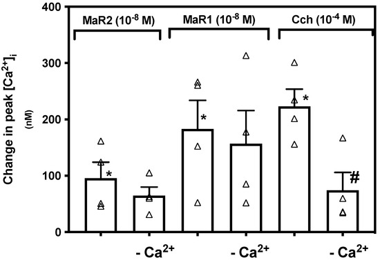 In conjunctival goblet cells MaR1 is not dependent on extracellular Ca2+ to increase [Ca2+]i [15]. To determine if MaR2 is dependent on influx of extracellular Ca2+, we incubated rat conjunctival goblet cells in vehicle with or without CaCl2 (1.0 mM). Supplementary Figure S3 indicates changes in [Ca2+]i over time. MaR2 with CaCl2 increased [Ca2+]i to a peak of 95.66 ± 28.34 nM (p = 0.015, Figure 6; n = 4), while MaR2 without CaCl2 increased [Ca2+]i to a peak of 64.74 ± 15.25 nM, a non-significant decrease (p = 0.37). A similar finding was detected for MaR1 (10−8 M) (Figure 6; n = 4). In contrast [Ca2+]i stimulated by Cch (10−4 M) was significantly decreased in the absence of extracellular Ca2+ (Figure 6; n = 4). We conclude that MaR2, similarly to MaR1, is independent of influx of extracellular Ca2+ to increase [Ca2+]i, but Cch is not.