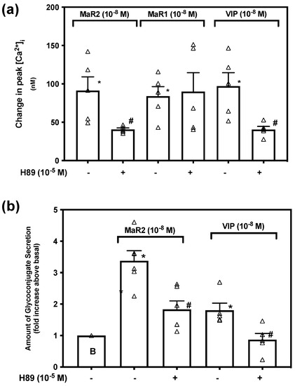When a ligand activates Gαs, adenylyl cyclase (AC) catalyzes ATP to cAMP that in turn stimulates the activity of cAMP dependent protein kinase A (PKA). This is one among a variety of functions of cAMP [32]. To explore if MaR2 uses PKA, we incubated rat conjunctival goblet cells with the PKA-inhibitor H89 (10−5 M) for 30 min prior to stimulation with MaR2 (10−8 M), or the positive controls VIP (10−8 M) and MaR1 (10−8 M). Supplementary Figure S6 indicates changes in [Ca2+]i over time. MaR2 increased [Ca2+]i to a peak of 91.27 ± 17.97 nM (p = 0.00010, Figure 9a; n = 5). Incubation with H89 increased [Ca2+]i to a peak of 40.66 ± 1.94 nM that was different from MaR2 alone (p = 0.023). The action of MaR1 was not inhibited by H89, but of VIP was blocked (Figure 9a; n = 5). This indicates that MaR2 activates PKA to increase [Ca2+]i.