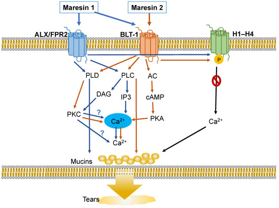 - Olsen, M.V.; Lyngstadaas, A.V.; Bair, J.A.; Hodges, R.R.; Utheim, T.P.; Serhan, C.N.; Dartt, D.A. Maresin 1, a specialized proresolving mediator, stimulates intracellular [Ca(2+)] and secretion in conjunctival goblet cells. J. Cell. Physiol. 2021, 236, 340–353. [Google Scholar] [CrossRef]