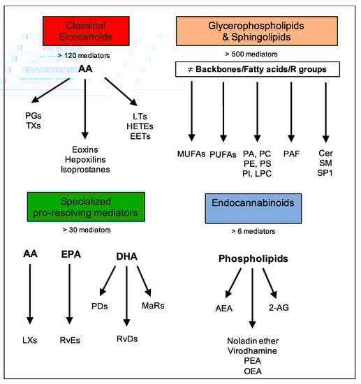 Classical eicosanoids, mostly derived from the omega-6 polyunsaturated fatty acid (PUFA) arachidonic acid (AA), are the most renowned superfamily of bioactive lipids, comprising more than 120 known mediators. These include leukotrienes (LTs), prostaglandins (PGs), thromboxanes (TXs), hydroxyeicosatetraenoic acids (HETEs), epoxides (EETs), eoxins, and hepoxilins. These are involved in immune and inflammatory processes, with the aims of amplifying inflammation, coordinating leukocyte recruitment, producing cytokines and chemokines as well as presenting antigens and forming antibodies, inducing cell proliferation and migration [].