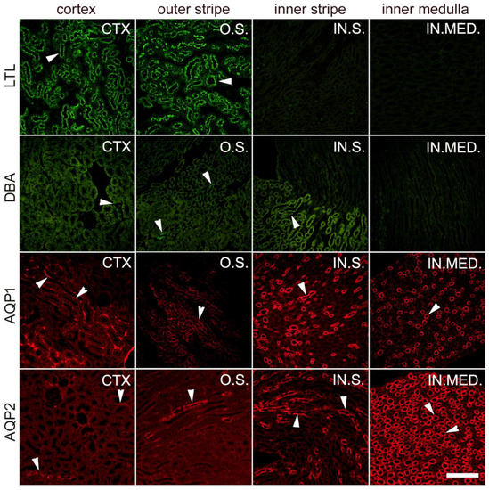 Distribution of tubular segment markers in different parts of the mice kidney. CTX.—cortex; O.S.—outer stripe of outer medulla; IN.S.—inner stripe of outer medulla; IN.MED.—inner medulla. Binding of Lotus tetragonolobus lectin (LTL) was specific to proximal tubules located in the cortex and outer stripe of the outer medulla (green; first row). Binding of Dolichos biflorus agglutinin (DBA) was found specifically in the distal tubules located in the cortex and in the outer and inner strips of the outer medulla (green; second row). The antibody against aquaporin 1 (AQP1) stained the proximal tubules in the cortex and outer stripe and the thin descending loop of Henle in the inner stripe and inner medulla (red; third row), whereas anti-aquaporin 2 (AQP2) stained various segments of the collecting ducts in the cortex, outer medulla, and inner medulla (red; fourth row). Scale-bar = 40 µm, refers to all (magnification 200×).