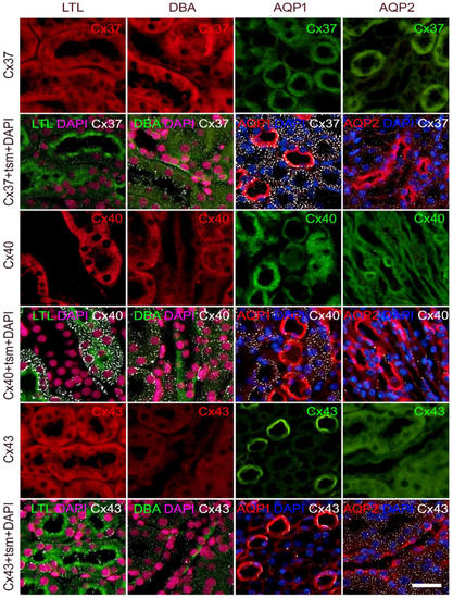 Colocalization of connexins 37, 40, and 43 with different tubular segment markers in the mice kidney. Sections from the wild-type mice. Lotus tetragonolobus lectin (LTL), proximal tubule marker (green; first column); Dolichos biflorus agglutinin (DBA), distal tubule marker (green; second column); aquaporin 1 (AQP1), thin descending loop of Henle marker (red; third column); aquaporin 2 (AQP2), collecting duct marker (red; fourth column). Nuclei were stained with DAPI (blue in third and fourth column; magenta—pseudocolorized in first and second column); tsm—tubular segment marker. Scale-bar = 20 µm, refers to all (magnification 400×).