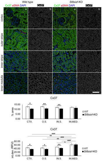 Expression of connexin 37 in different renal parts of the wild type and St8sia1-KO mice. WT—wild-type mice; St8sia1-KO—St8sia1 knockout mice; CTX.—Cortex; O.S.—outer stripe of outer medulla; IN.S.—inner stripe of outer medulla; IN.MED.—inner medulla; % area—percentage of the section area occupied by Cx37 immunofluorescence; int.den. (RFU)—integrated density (relative fluorescence units). Column a—representative photomicrographs of the indicated kidney section areas stained with Cx37 (green) and alpha smooth actin (aSMA, red) antibodies; cell nuclei are stained blue. Column b—(same section as a) processed and thresholded photomicrographs prepared for analysis (inverted black for white on tresholded green image). Statistically significant difference between WT and St8sia1-KO: * p < 0.05; ** p < 0.01 (t-test for unequal variances). Comparison between different kidney areas in the same group—WT: & p < 0.05; && p < 0.01; or St8Sia1-#### p < 0.0001 (one-way ANOVA followed by Tukey’s test for dependent samples). Scale-bar = 20 µm, refers to all (magnification 400×).