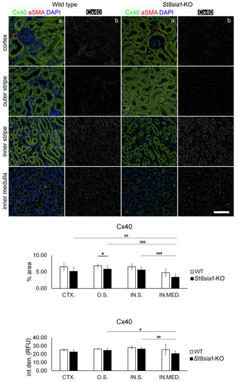 Expression of connexin 40 in different renal parts of the wild type and St8sia1-KO mice. WT—wild-type mice; St8sia1-KO—St8sia1 knockout mice; CTX.—cortex; O.S.—outer stripe of outer medulla; IN.S.—inner stripe of outer medulla; IN.MED.—inner medulla; % area—percentage of sectional area occupied by Cx40 immunofluorescence; int.den. (RFU)—integrated density (relative fluorescence units). Column a—representative photomicrographs of the indicated kidney section areas stained with Cx40 (green) and alpha-smooth actin (red) antibodies; cell nuclei are stained in blue. Column b—(same section as a) processed and thresholded photomicrographs prepared for analysis (inverted black for white on thresholded green image). Statistically significant difference between WT and St8sia1- KO: * p < 0.05 (t-test for unequal variances). Comparison between different kidney areas in the same group: WT—there was no significant difference; for St8Sia1-# p < 0.05, ## p < 0.01, ### p < 0.001 (one-way ANOVA followed by Tukey’s test for dependent samples). Scale-bar = 20 µm, refers to all (magnification 400×).