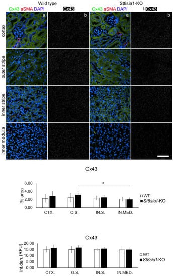 Expression of connexin 43 in different renal parts of the wild type and St8sia1-KO mice. WT—wild-type mice; St8sia1-KO—St8sia1 knockout mice; CTX.—Cortex; O.S.—outer stripe of outer medulla; IN.S.—inner stripe of outer medulla; IN.MED.—inner medulla; % area—percentage of sectional area occupied by Cx43 immunofluorescence; int.den. (RFU)—integrated density (relative fluorescence units). Column a—representative photomicrographs of the indicated kidney sections stained with Cx43 (green) and alpha-smooth actin (red) antibodies; nuclei are stained in blue. Column b—(same section as a) processed and thresholded photomicrographs prepared for analysis (inverted black for white on thresholded green image). There was no significant difference in Cx43 expression between WT and St8sia1-KO. Comparison between different kidney areas in the same group WT—there was no significant difference; for St8Sia1-# p < 0.05 (one-way ANOVA followed by Tukey’s test for dependent samples). Scale-bar = 20 µm, refers to all (magnification 400×).