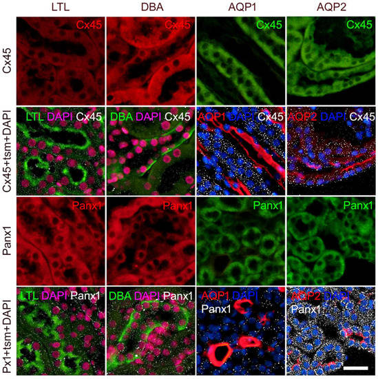 Colocalization of connexin 45 and Panx1 with different tubular segment markers in the mice kidney. Sections from the wild-type mice. Lotus tetragonolobus lectin (LTL), proximal tubule marker (green; first column); Dolichos biflorus agglutinin (DBA), distal tubule marker (green; second column); aquaporin 1 (AQP1), thin descending loop of Henle marker (red; third column); aquaporin 2 (AQP2), collecting duct marker (red; fourth column). Nuclei were stained with DAPI (blue in third and fourth column; magenta—pseudocolorized in first and second column); tsm—tubular segment marker. Scale-bar = 20 µm, refers to all (magnification 400×).