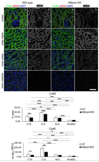 Expression of connexin 45 in different renal parts of the wild type and St8sia1-KO mice. WT—wild-type mice; St8sia1-KO—St8sia1 knockout mice; CTX.—Cortex; O.S.—outer stripe of outer medulla; IN.S.—inner stripe of outer medulla; IN.MED.—inner medulla; % area—percentage of the section area occupied by Cx45 immunofluorescence; int.den. (RFU)—integrated density (relative fluorescence units). Column a—representative photomicrographs of the indicated kidney section areas stained with Cx45 (green) and alpha-smooth-actin (red) antibodies; nuclei are stained blue. Column b—(same section as in a) processed and thresholded photomicrographs prepared for analysis (inverted black for white on thresholded green image). Statistically significant difference between WT and St8sia1-KO: * p < 0.05; ** p < 0.01; *** p < 0.001 (t-test for unequal variances). Comparison between different kidney areas in the same group of mice WT: & p < 0.05, && p < 0.01, &&&& p < 0.0001; or St8Sia1-#—p < 0.05. ## p < 0.01, #### p < 0.0001 (one-way ANOVA followed by Tukey’s test for dependent samples). Scale-bar = 20 µm, refers to all (magnification 400×).
