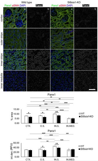 Expression of pannexin 1 in different renal parts of the wild type and St8sia1-KO mice. WT—wild-type mice; St8sia1-KO—St8sia1 knockout mice; CTX.—Cortex; O.S.—outer stripe of outer medulla; IN.S.—inner stripe of outer medulla; IN.MED.—inner medulla; % area—percentage of the section area occupied by Panx1 immunofluorescence; int.den. (RFU)—integrated density (relative fluorescence units). Column a—representative photomicrographs of the indicated kidney sections stained with Panx1 (green) and alpha-smooth actin (red) antibodies; nuclei are stained in blue. Column b—(same section as a) processed and thresholded photomicrographs prepared for analysis (inverted black for white on thresholded green image). Statistically significant difference between WT and St8sia1-KO: * p < 0.05; ** p < 0.01; (t-test for unequal variances). Comparison between different kidney areas in the same group of mice WT: && p < 0.01, &&& p < 0.001, &&&& p < 0.0001; or St8Sia1-## p < 0.01. ### p < 0.001, #### p < 0.0001 (one-way ANOVA followed by Tukey’s test for dependent samples). Scale-bar = 20 µm, refers to all (magnification 400×).