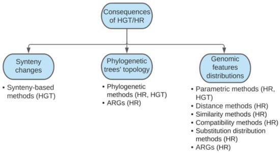 There are three groups of methods for revealing HGT, with two of them being similar to what is applied in HR detection. []. The first group is represented by parametric methods, that are aimed to find genetic loci with properties that differ from the genomic average, including GC content [], oligonucleotide spectrum [], DNA structure modeling [], and genomic context []. The second group, namely, phylogenetic methods, falls into two subcategories: explicit and implicit phylogenetic methods [] with the former comparing trees’ topologies and the latter analyzing distances between genomes []. The third group examines changes in synteny, i.e., the co-localization of genetic loci in the same regions [].
