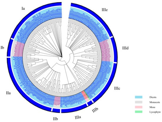 To better understand the evolutionary origin of the plant CAMTA proteins, a maximum-likelihood (ML) phylogenetic tree based on the alignment of full-length CAMTA proteins was constructed (Figure 1; Table S1). In all, 262 CAMTA proteins from 42 plant species were clustered into three major groups (I–III). The three groups were further divided into different subgroups. Groups I, II, and III have two, three, and five subgroups, respectively. Rahman et al. also constructed a phylogenetic tree with 200 CAMTA proteins from 35 plant species, which clustered these proteins into three groups (I–III) []. However, they divided groups I and II into two subgroups, while group III was separated into five subgroups []. A phylogenetic tree containing five crops and arabidopsis was constructed by Shen et al., and these CAMTA proteins were grouped into six groups []. Recently, to explore the evolutionary relationships of the CAMTA family in gossypium species, a phylogenetic tree of 17 species with 122 CAMTAs was built []. The CAMTA proteins were divided into five major groups (I–V), and groups I, IV, and V were further divided into two subgroups. Interestingly, all four CAMTAs from the lower non-flowering land plants (moss and lycophyte) were gathered into group IIIb, while the other 258 CAMTAs from the higher flowering land plants were distributed in the other groups. These are also in agreement with the previous study, where the lower plants (moss and lycophyte) were settled in the basal group [,,]. Meanwhile, CAMTA proteins in monocots and dicots were concurrent in three major groups (I–III), which were divided clearly into different subgroups, suggesting their evolutionary divergence before the common ancestor of monocots and dicots. Here again, previous studies have shown that, before the divergence between monocots and dicots and probably even before the divergence between higher flowering plants and lower non-flowering land plants, all CAMTA proteins shared a common ancestry [,,].