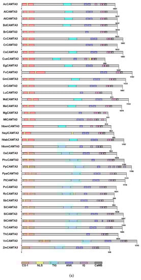 Ankyrin repeats (ANKs), a domain involved in protein–protein interactions, contain 33 amino acids [,]. Most of the CAMTA3s (70.3%) have two ANK repeats in 37 plant species (Figure 2a). The repetitive motif IQXXXRGXXX of IQ motifs can bind with CaM and CaM-like proteins []. However, the number of IQ motifs in different plant species is uncertain. In Figure 2a, except for MtCAMTA3 and PpCAMTA3, all other CAMTA3 proteins were predicted to contain two or three IQ motifs. Rahman et al. (2016) reported that the ancestor of CAMTAs might contain two IQ motifs through analyzing 200 CAMTAs. CaMB, responsible for binding with Ca2+/CaM, is a motif that is unique to CAMTAs []. It exists in all plant CAMTA proteins except in Caenorhabditis elegans [,]. All CAMTA3 proteins were predicted to contain the CaMB domain (Figure 2a). Qiu et al. demonstrated that, when mutations lead to the loss of CaM-binding ability of CAMTA3, the effect on the plant’s defense against insect attack was similar to the effect of losing functionality of CAMTA3 [].