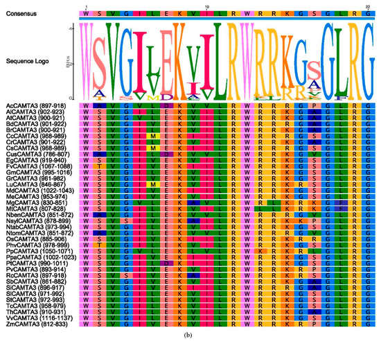 Multiple sequence alignments and sequence logos of the CaMB domain were drawn using Geneious version 9.1 (Biomatters Ltd., Auckland, New Zealand) (http://www.geneious.com (accessed on 28 February 2022)). The corresponding consensus motifs were shown above with the sequence logo.