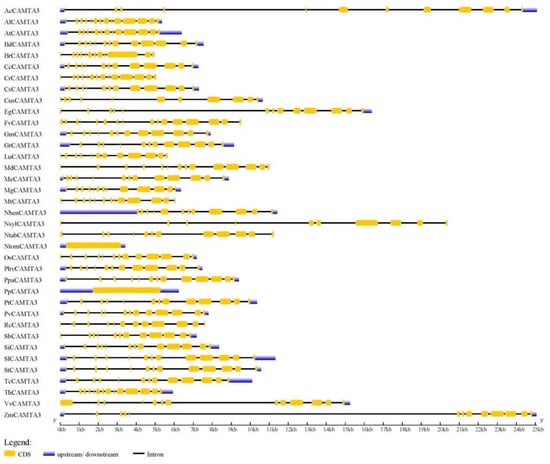 Gene structure of CAMTA3/SR1 in different plant species. The untranslated regions (UTRs) are indicated by thick blue boxes; the exons are indicated by thick yellow boxes; the introns are indicated by black lines.