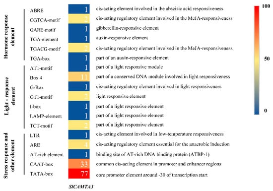The DNA sequences of SlCAMTA3 genes were obtained from the tomato genome sequence, and cis-acting elements in the promoter region were analyzed in the PlantCARE database for Flanders Institute for Biotechnology (VIB) (http://bioinformatics.psb.ugent.be/webtools/plantcare/html/ (accessed on 10 March 2022)).