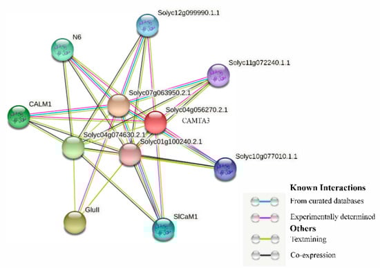 Interaction network maps of tomato SlCAMTA3 proteins were constructed using the STRING (Hinxton, Cambridgeshire, UK) (http://STRINGdb.org/ (accessed on 15 March 2022)) online tool.