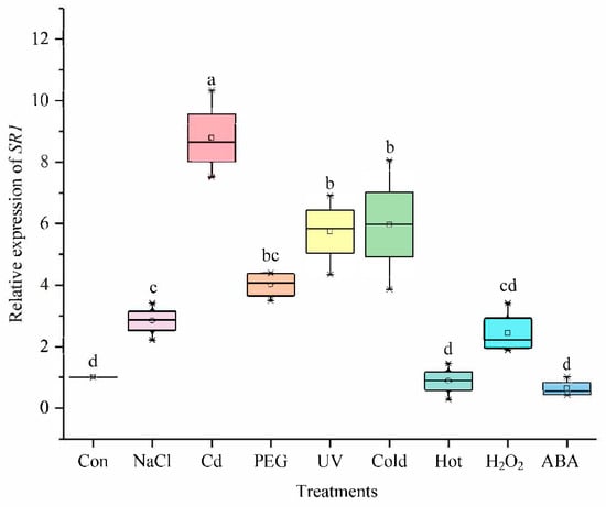The expression levels of SlCAMTA3/SR1 genes under different treatments. The central line for each box plot indicates the median. The top and bottom edges of the box indicate the 75th and 25th percentiles, respectively. The values with different letters are significantly different according to Duncan’s multiple tests (p < 0.05).