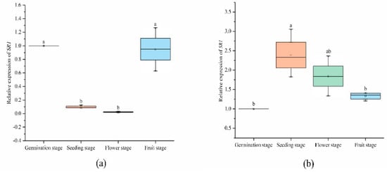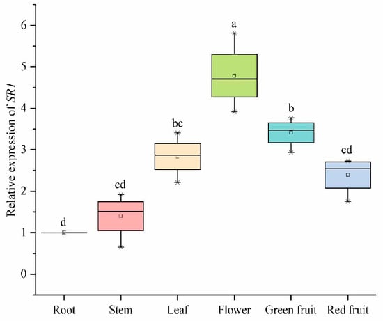 Expression levels of SlCAMTA3/SR1 genes of different organs in the reproductive growth period. The central line for each box plot indicates the median. The top and bottom edges of the box indicate the 25th and 75th percentiles, respectively. The values with different letters are significantly different according to Duncan’s multiple tests (p < 0.05).