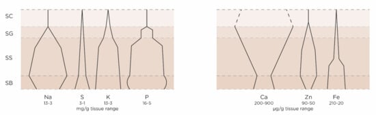 Detection and quantitation of elements depend on the methods used, i.e., their sensibility and accuracy [17,18,19,20,21,22,23,24,25,26]. The outcomes may also vary due to the conditions in which the specimens are studied (in vivo, lyophilized, previously dissociated/dissected tissues). Therefore, the reported results must be examined in the light of sound comparisons taking into account all the variables and in relation with already gained basic knowledge on elements’ role in physiology. Distribution of most abundant minerals in human epidermis is schematically presented in Figure 1.