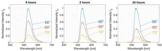 Representative fluorescence spectra from subcultures with 56–64 cell splittings are depicted in Figure 1 for Total Internal Reflection (TIR) angles of 66°, 69°, and 73° after 72 h cell growth and (subsequently) 0 h (control), 2 h, or 24 h incubation with doxorubicin in cultivation medium. The spectra are characteristic for Green Fluorescent Protein (GFP) with emission maxima around 530 nm, although some overlap by the fluorescence of intracellular doxorubicin or its degradation products, e.g., 7,8-dehydro-9,10-desacetyldoxorubicinone [], cannot be excluded. At increased incubation times, the fluorescence signal shows a stronger decrease with an increasing angle of incidence, i.e., with a decreasing penetration depth of the evanescent field (see also Supplementary Material, Figure S1).