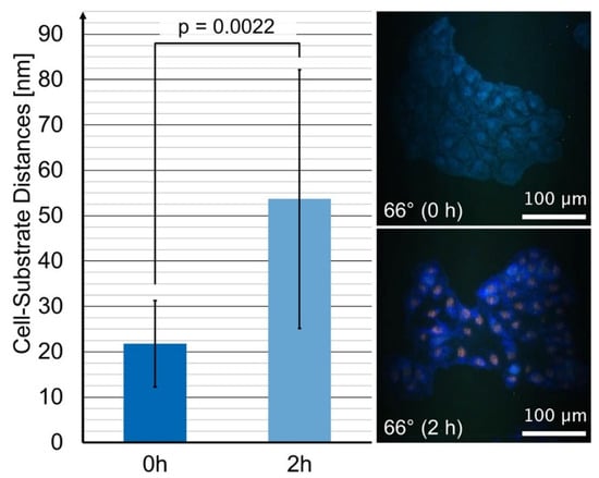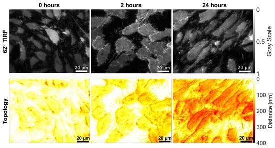 This result is confirmed by Figure 2, which shows representative fluorescence images at 66° excitation as well as the cell-substrate topology calculated for 0 h, 2 h, and 24 h incubation with doxorubicin according to Equation (2). In addition to the increasing density of cells at 24 h (due to the longer growth time), the images of cell topology show larger cell-substrate distances with increasing incubation time.