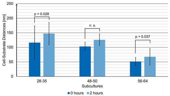 Most frequent cell-substrate distances evaluated from all histograms of the subcultures with 28–35, 48–50, and 56–64 cell splittings as mean value ± standard deviation including the p-values for statistical significance (p ≤ 0.05: statistically significant; n.s.: nonsignificant). Results are shown for 0 h and 2 h incubation with doxorubicin (2 µM).