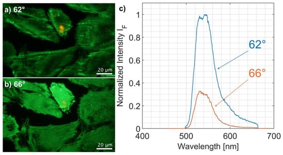 It should be mentioned that some fluorescence of doxorubicin or its degradation product [] may overlap GFP fluorescence, as proven for whole-cell experiments (upon illumination at Θ = 62°, i.e., below the critical angle of incidence, ΘC). As shown in Figure 5, this overlap becomes obvious in the cell nucleus (at Θ = 62°) and is very low in the TIRFM experiments (Θ ≥ 66°). Therefore, fluorescence of doxorubicin or its degradation product probably does not—or only very slightly—falsify our experimental results on cell-substrate distances based on TIRFM.