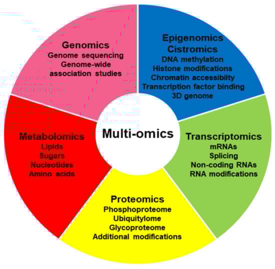 A variety of preclinical models for prostate cancer, including cell lines, organoids, xenografts and genetically modified mouse models, as well as numerous patient-derived xenograft (PDX) models, are now available for evaluating the origins and therapy response of prostate cancer, but each of them can only provide limited answers []. Further, there is an increasing amount of data published from patients suffering from prostate cancer at an early or late stage and undergoing treatment. A diversity of omics-based platforms is now usable, including genomics, epigenomics, cistromics, transcriptomics, proteomics and metabolomics approaches, to examine the underlying process in detail and understand the various alterations taking place (Figure 1). Selected essential discoveries in each discipline will be summarized below and new, multi-omics procedures that integrate these findings to generate the bigger picture will be further discussed.