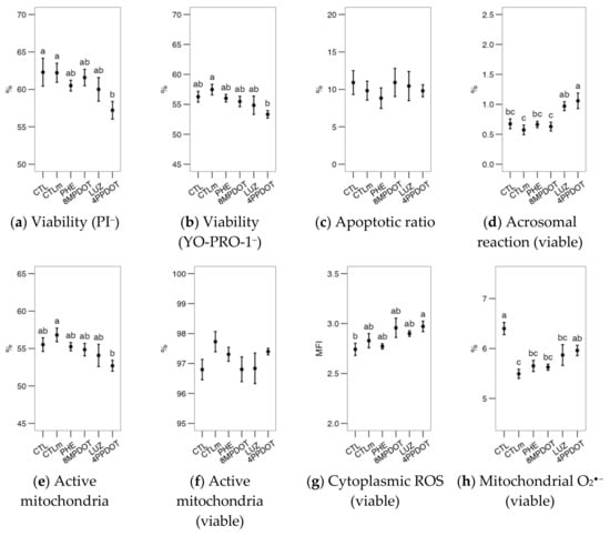 The response of the cells to the treatments was tested with fluorescence probes and flow cytometry as described previously [61,62,63]: Hoechst 33342 (H342, for debris discrimination, specifically labeling nuclei) at 5 µM; YO-PRO-1 (YP1, apoptotic changes detection) at 100 nM; Fluo-4 (intracellular Ca2+ concentration assessment) at 100 nM; CM-H2DCFDA (CFDA, cytoplasmic ROS) at 5 µM; Merocyanine 540 (M540, plasmalemma changes related to capacitation) at 2 µM; propidium iodide (PI, viability) at 1 µM; PNA-Alexa Fluor 647 (PNA, peanut agglutinin, acrosomal integrity) at 1 µg/mL; MitoTracker deep red (MT, mitochondrial status) at 100 nM; and MitoSOX (MSX, mitochondrial superoxide assessment) at 1 µM. The probes were combined in TALP-HEPES as H342/Fluo-4/M540/PI/PNA, H342/CFDA/PI, and H342/YP/MSX/MT.