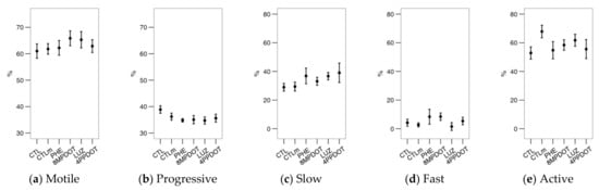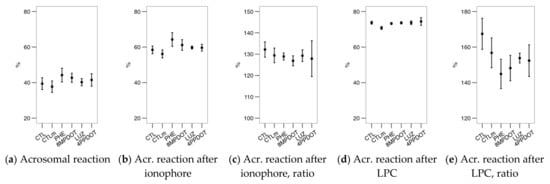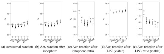 The acrosomal reaction was unaffected by any treatment (Figure 8a), with no apparent differential responses after the calcimycin or LPC challenges (Figure 8b,e). There were no significant effects of the treatments on the CTC pattern (Figure 9) or motility (Figure 10). Considering the sperm motility cluster analysis, it yielded three subpopulations as with the bull sperm analysis (Table 2). Similar to that case, the “active” subpopulation was predominant. However, the treatments did not contribute significantly to the variability within subpopulations (Figure 10c,d).