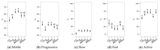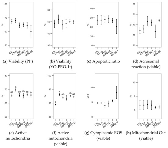 Data were analyzed in the R statistical environment [66]. Since sperm samples were obtained from different males with no pooling (seven for bull; five for deer), multilevel modeling was used to account for between-male variability, employing linear mixed-effects models [68] with the treatment as a fixed effect and the male as a random effect. Results were expressed as mean ± SEM of each response parameter.